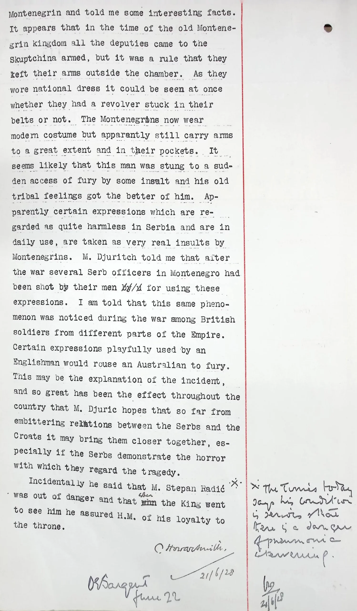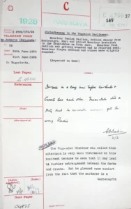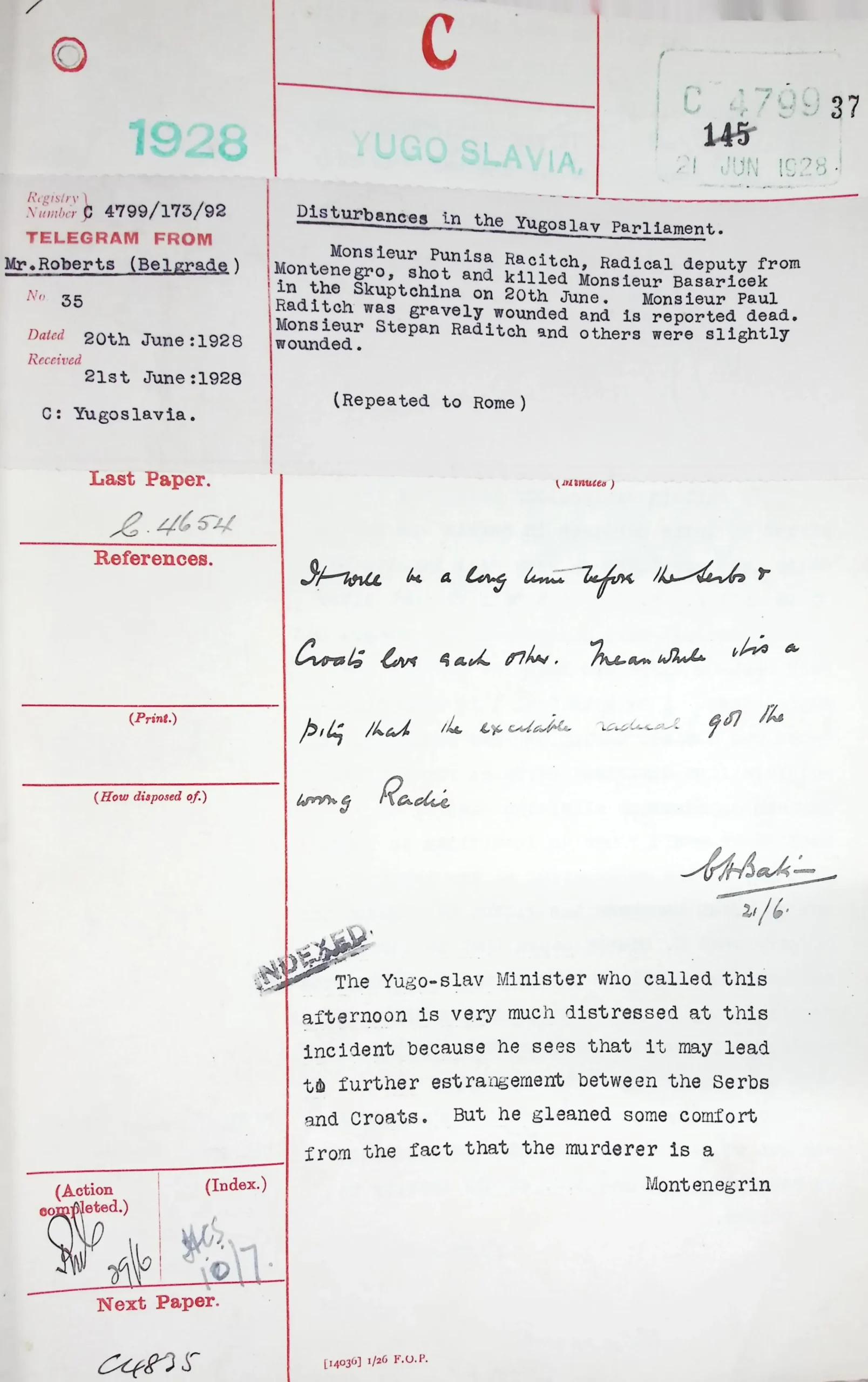 Telegram sent by Roberts from the British Legation in Belgrade to the Foreign Office in London, Belgrade, June 20, 1928, in the subject “Disturbances in the Yugoslav Parliament. Monsieur Punisa Racic, Radical deputy from Montenegro, shot and killed Monsieur Basarichek in the Skuptchina on 20th June”, TNA, FO 371/12982.
