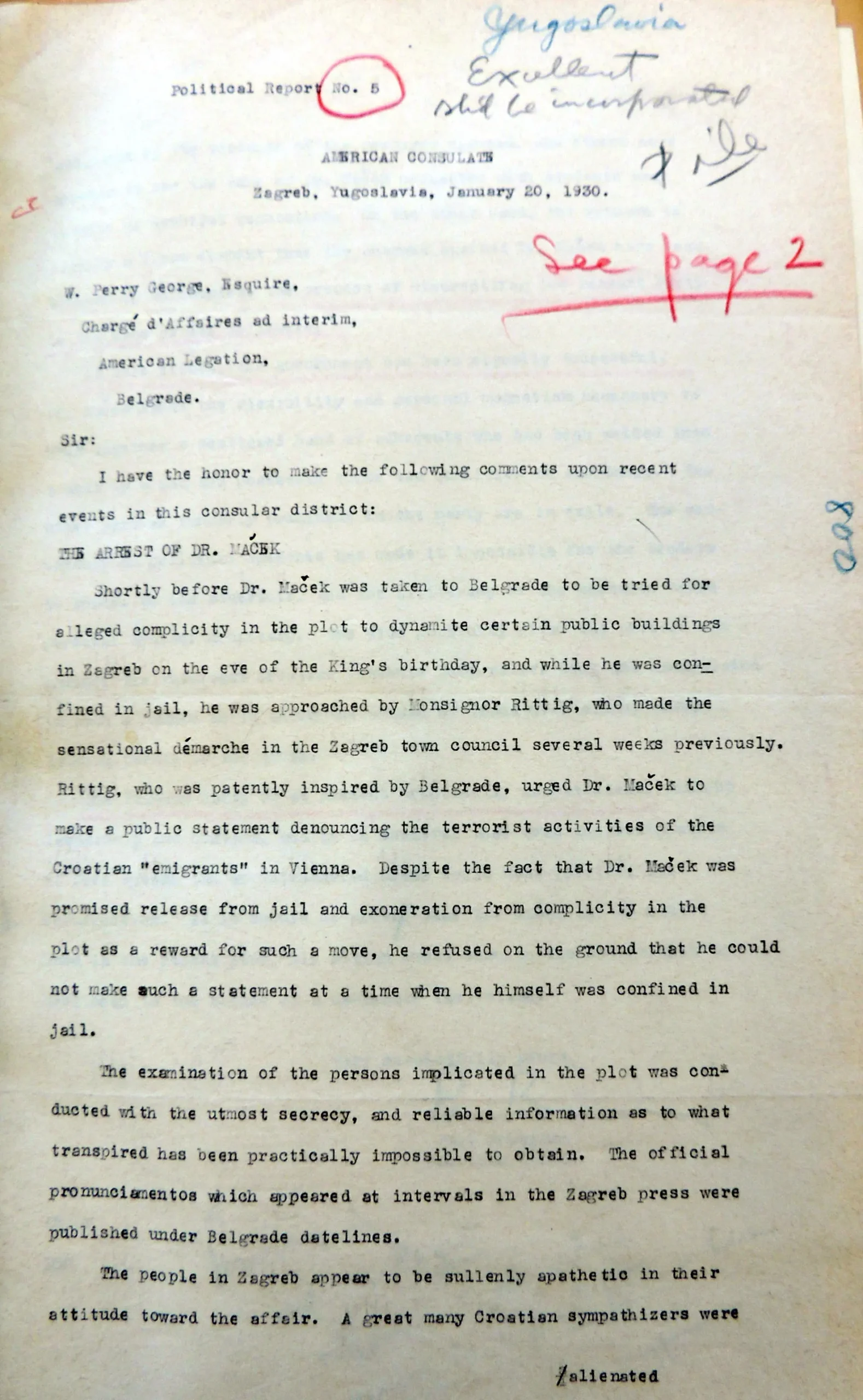 Political report no. 5 sent by Consul Paul Bowerman from Zagreb to the chargé d’affaires at the American Legation in Belgrade, W. Perry George, on January 20, 1930, NACP, RG 84, Yugoslavia, Vol 115.