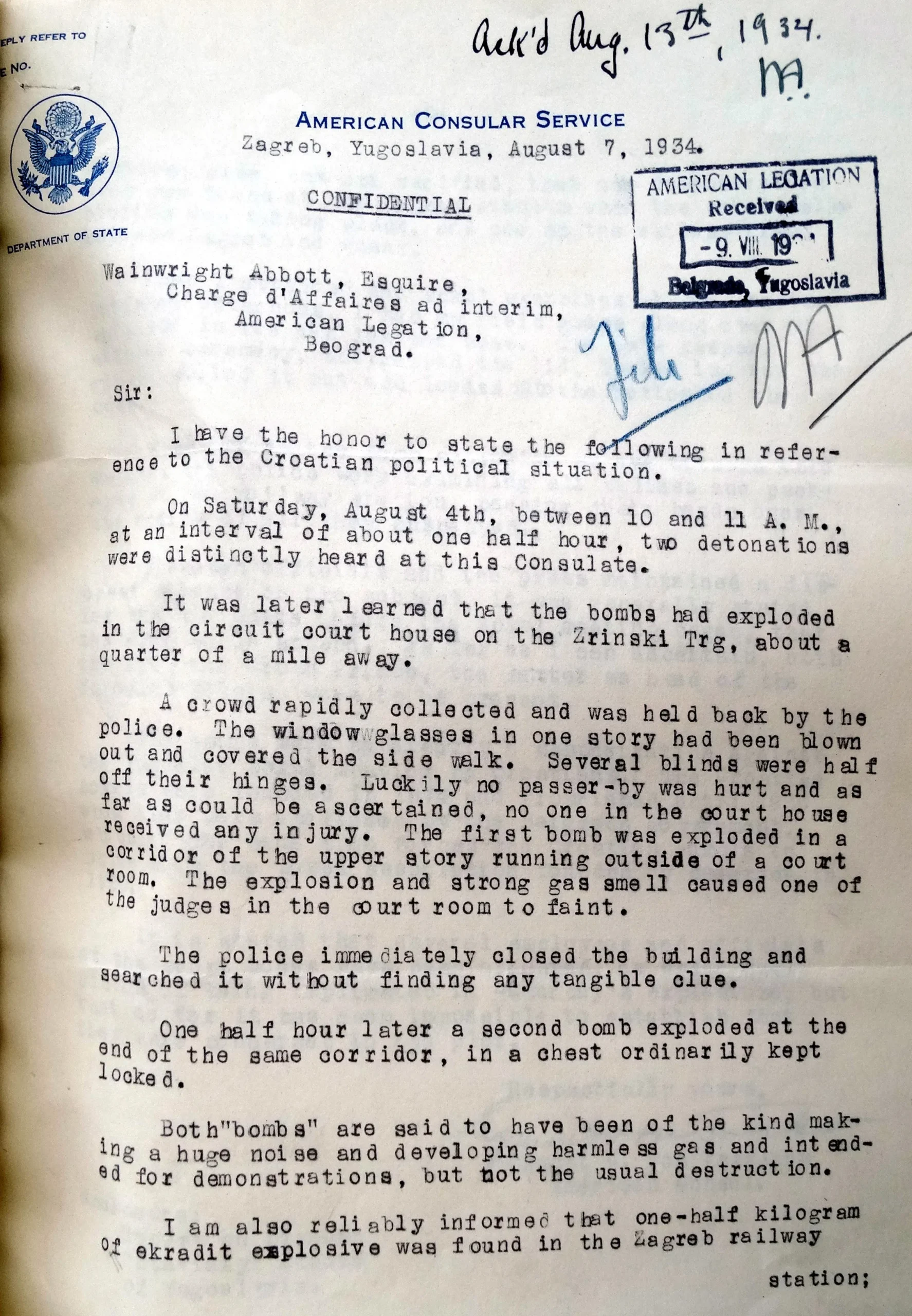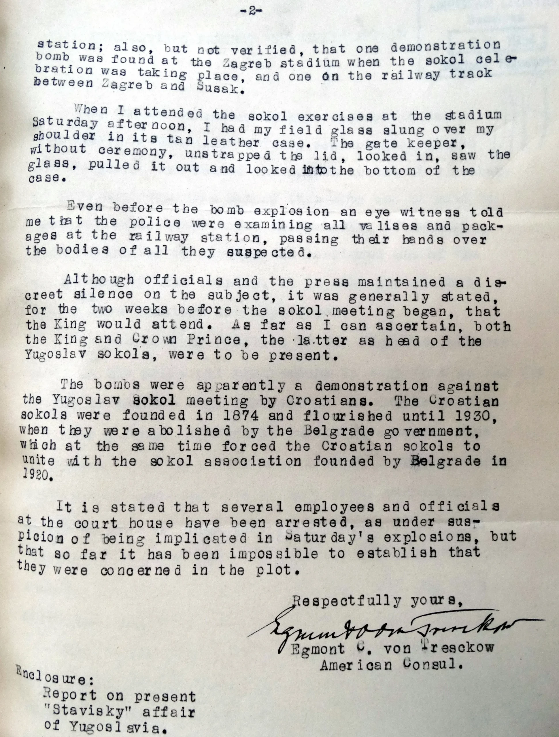 Report sent by Consul Egmont C. von Tresckow from Zagreb to Chargé d’Affaires at the American Legation in Belgrade, Weinwright Abbott, on August 7, 1934, NACP, RG 84, Yugoslavia, Vol. 134.